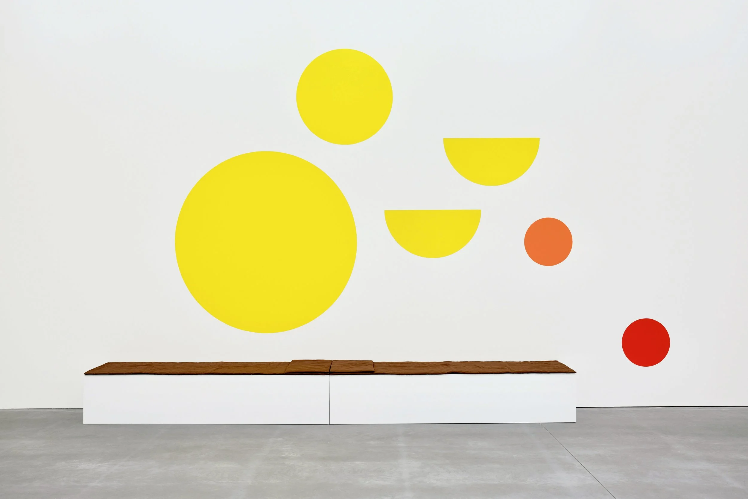 The circles and semicircles on the wall suggest an abstract landscape, while the two benches with hand-sewn cushions and blankets invite viewers to sit or lie down and physically interact with the sculpture. The title, taken from Rebecca Solnit's 2005 book of essays, A Field Guide to Getting Lost, prompts meditation and poetic reflection, urging us to question our existence, the passage of time, and our navigation through the world.